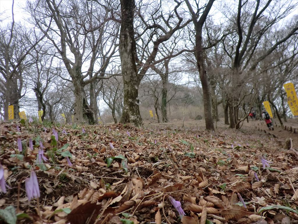御幸ヶ原にあるカタクリの群生地。ちょうど「カタクリの花まつり」期間中でしたけど、この天気と寒さで元気が無いカタクリ。
