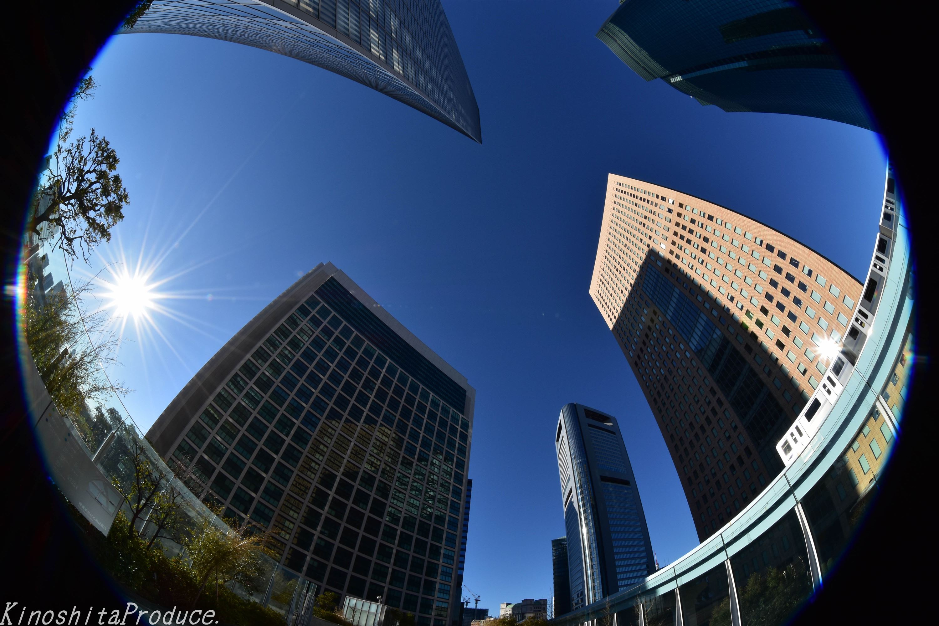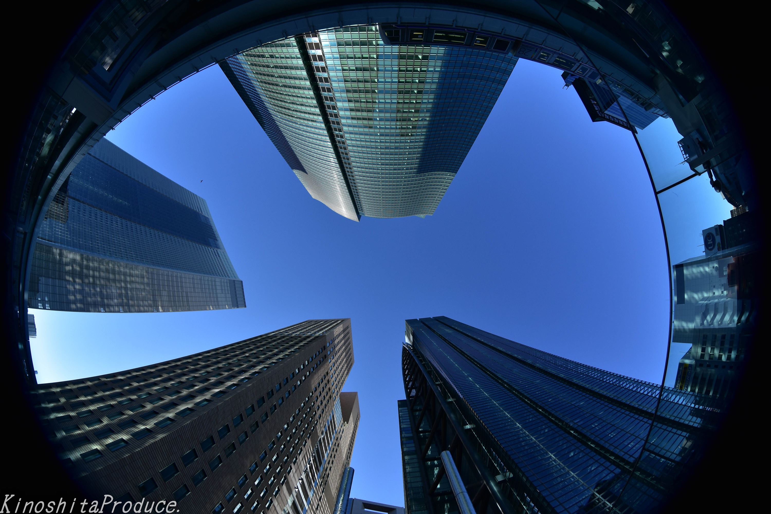汐留界隈のビル群をフィッシュアイで撮影。なんかマンハッタンみたい?知らないけど・・・。