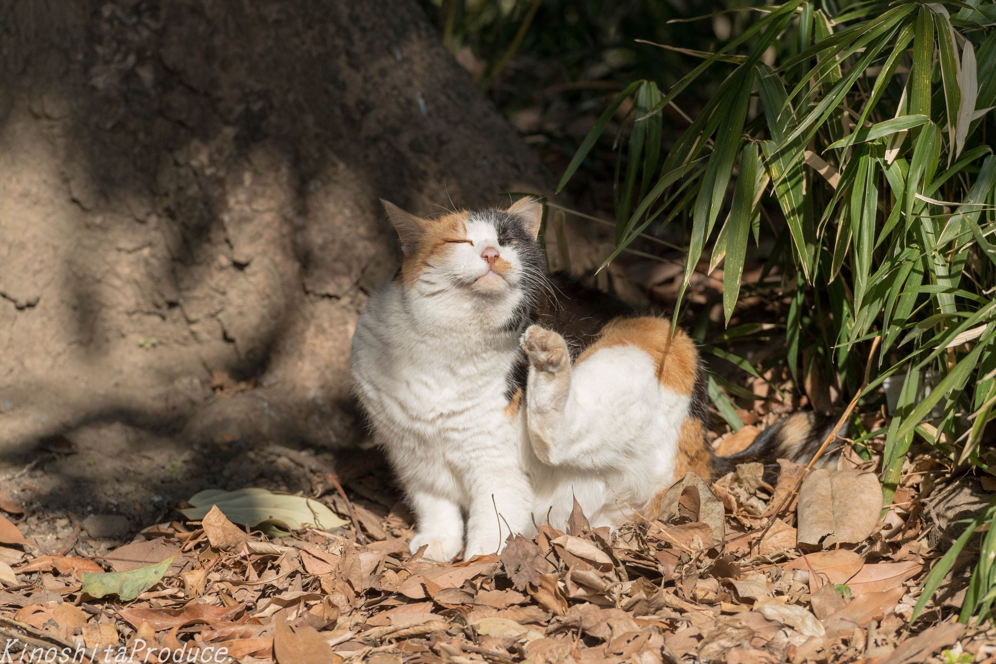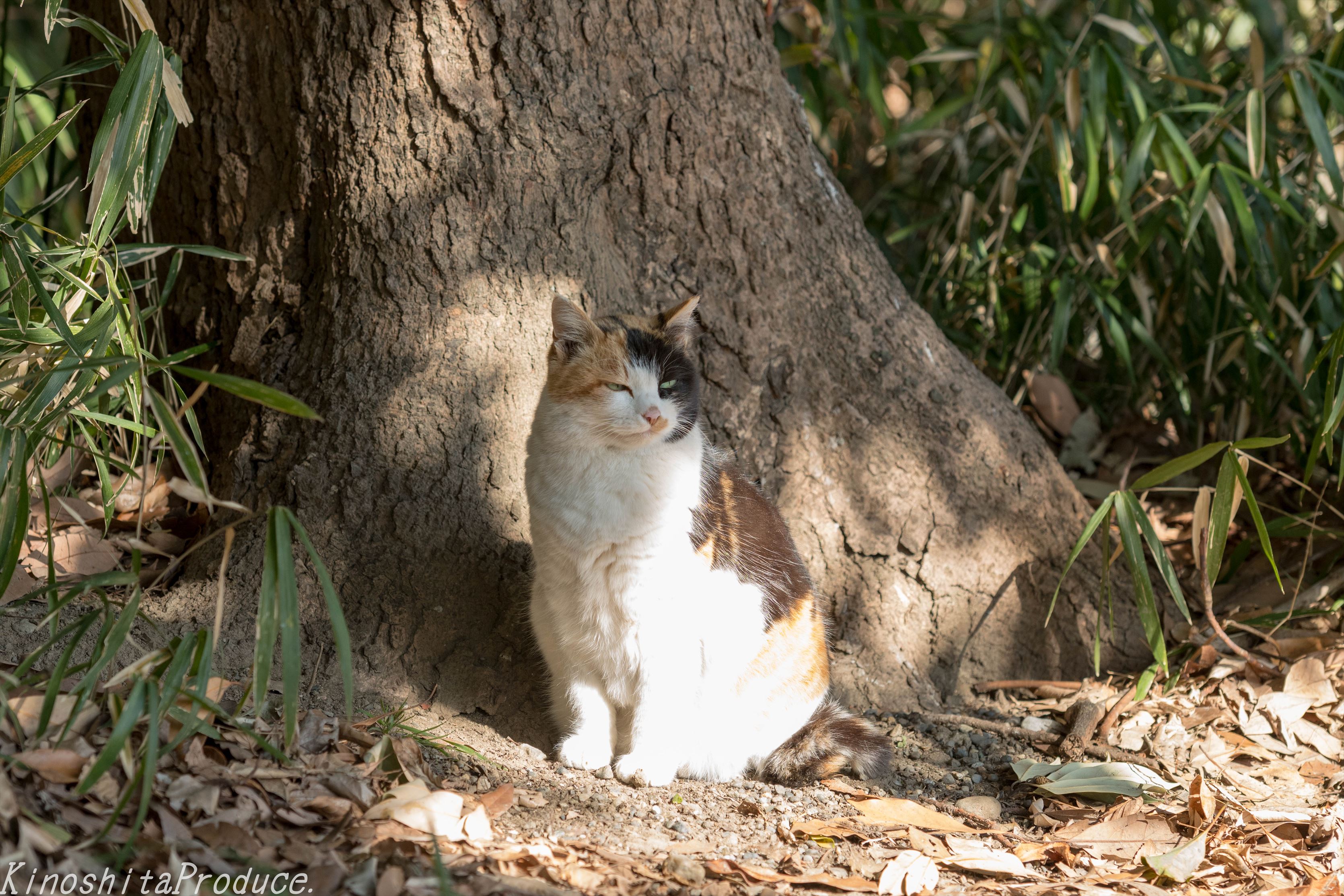 三毛猫。この庭園には2~3匹のネコが住み着いているようでこの三毛猫はよく見かけるお嬢さん。いつもは神社方面の森にいるのだがみかけないなあと思ったら船着場の近くで毛づくろい中だった。朝家を出てから今まで何も飲まずに4時間ほど活動。喉が渇いたので定番の休憩エリアの船着き場のベンチにリュックとカメラを下ろし自販機へ行こうとしたら、彼女がいたのでちょっとビックリ。ちょうど陽のあたる温かい場所でまったりと毛づくろい。ときたまこちらを伺うものの人間なんて知ったコッチャないってな感じ。