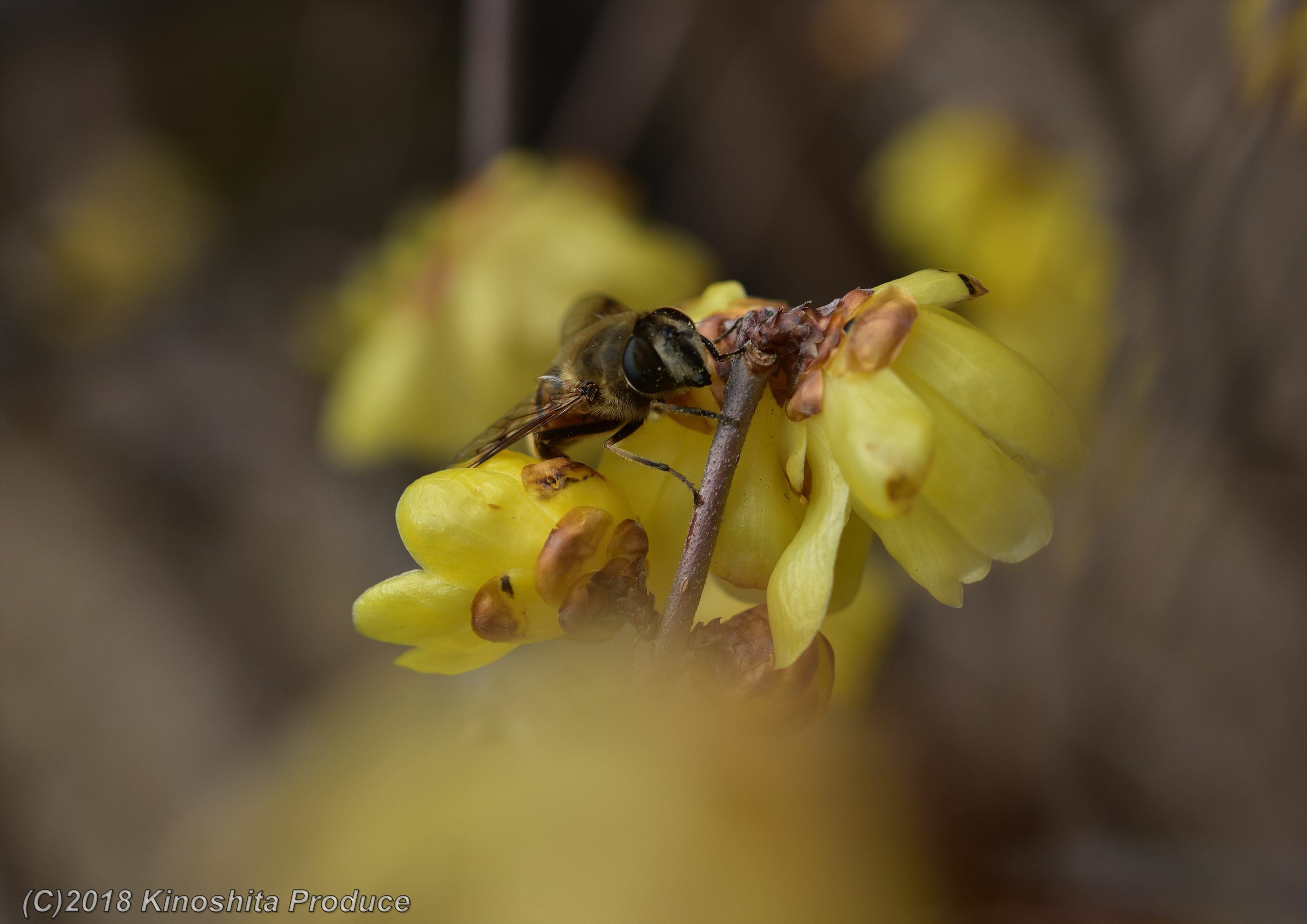 そんなソシンロウバイを撮影していたら、ハナアブが休憩しに停まりました。ロウバイの花を前ボケで撮影。