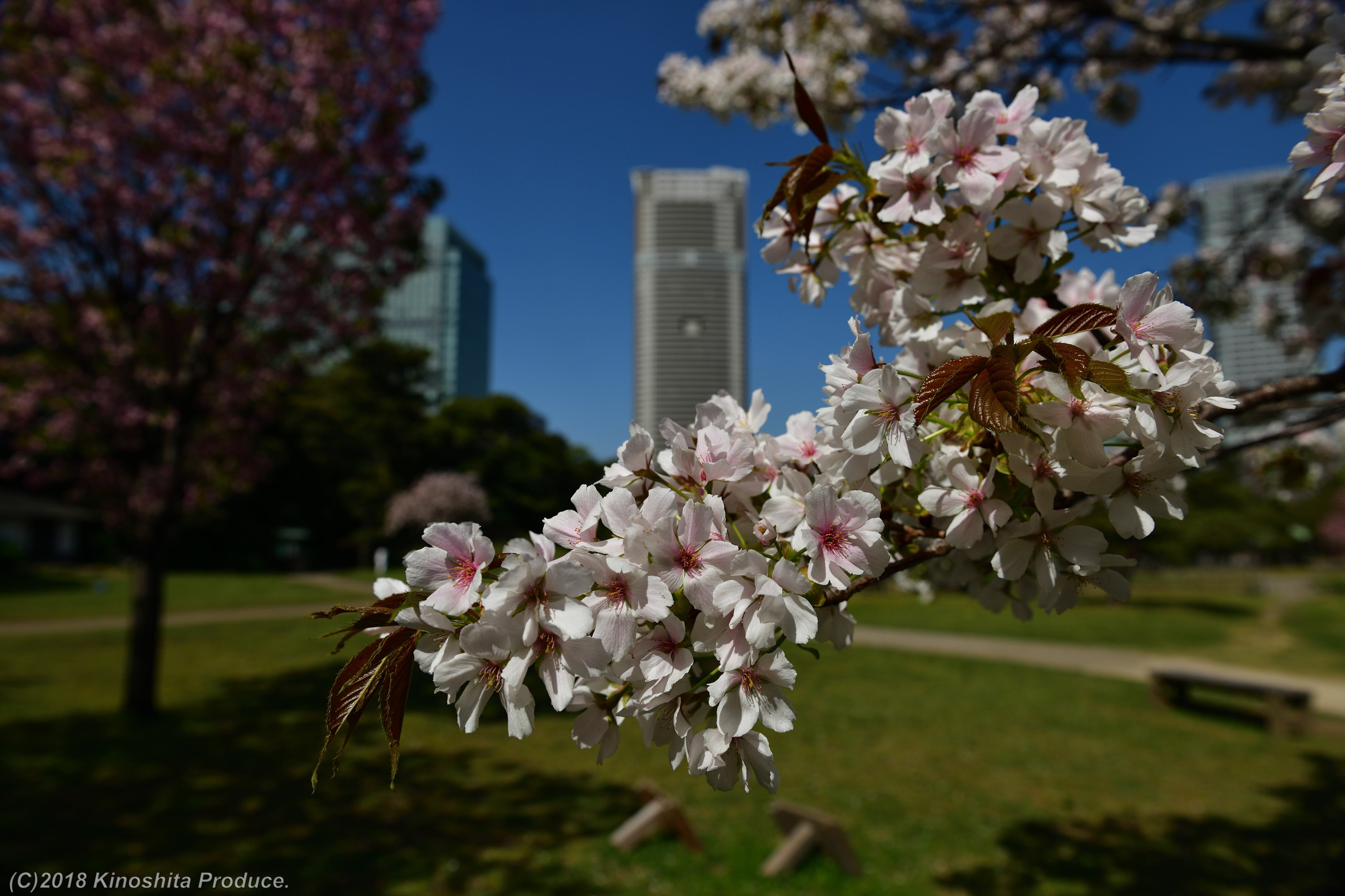 駿河台匂。花びらはソメイヨシノに似ている。花の付き方はサトザクラ。匂いって付くくらいなのか、唯一ミツバチがたくさん活動中だった。