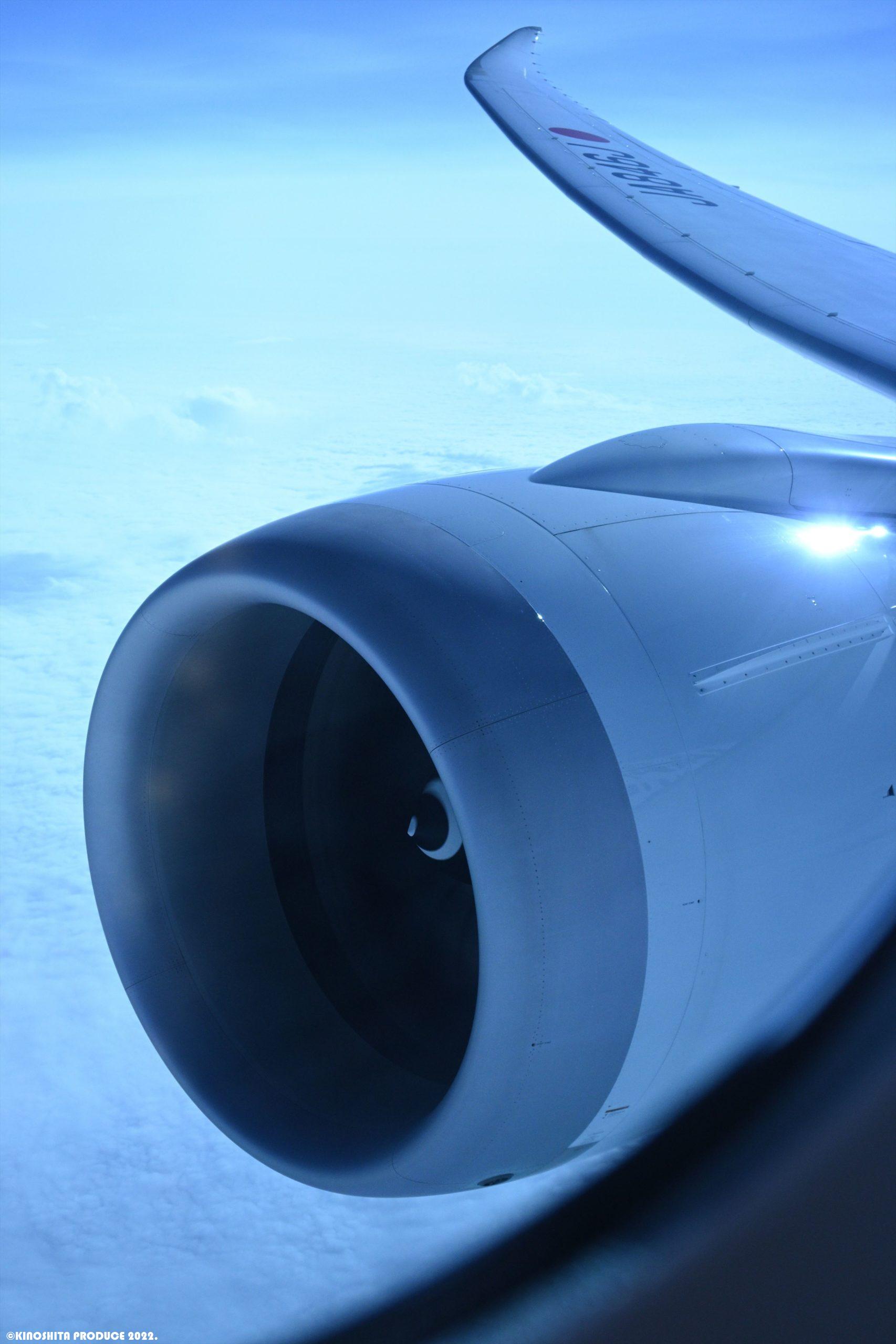 この日、一番かっこいい写真。全体がブルーなのはウィンドシールドを暗くしている影響から。かえって良い感じにフィルターになっている。ただこの7Kという座席から2番エンジンを撮影するのはとても大変で、思い切り振り向く感じなるから周囲からみると変な格好なわけ。