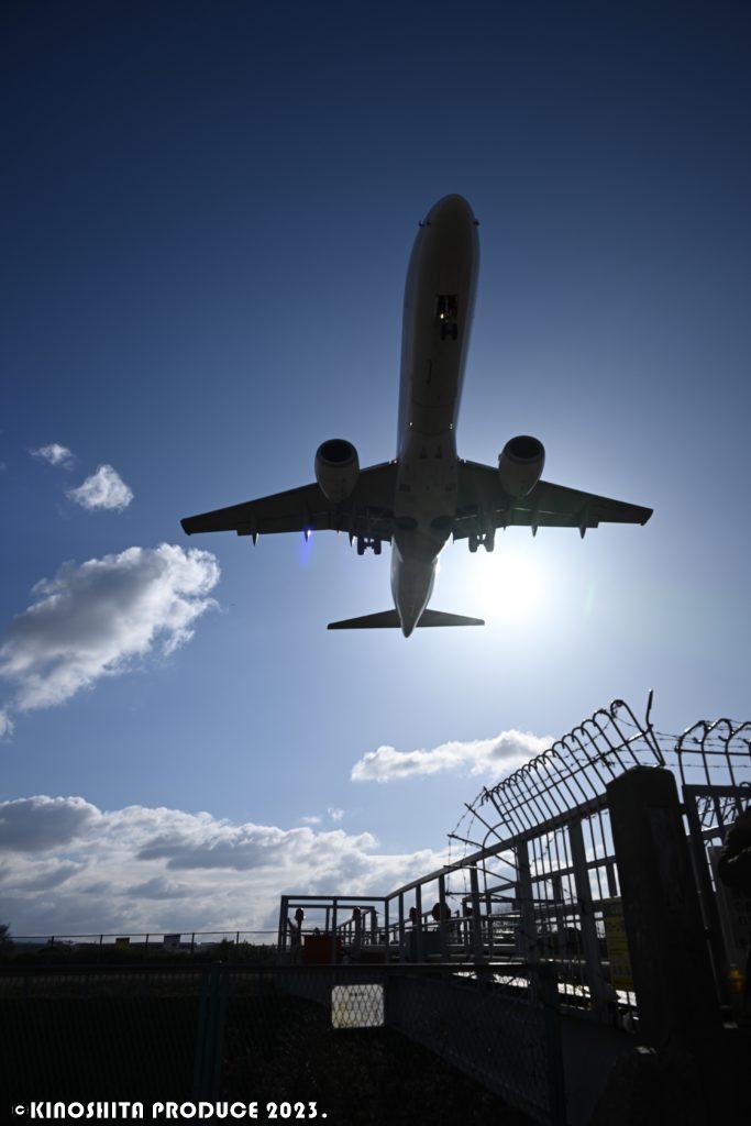 滑走路中心延長線上。太陽の逆光がいい具合になっている。