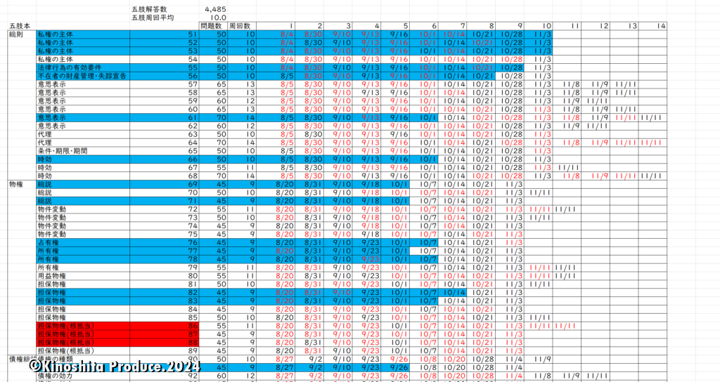 総則なんてこの表から分かるけど意思表示が苦手だったことがわかる。今日、実際に総則を解いてもやっぱり苦手だった・・・だったらそこを重点的にこなそう・・・となれば、最初から最後まですべてをまんべんなくこなす必要は無いわけだからね。