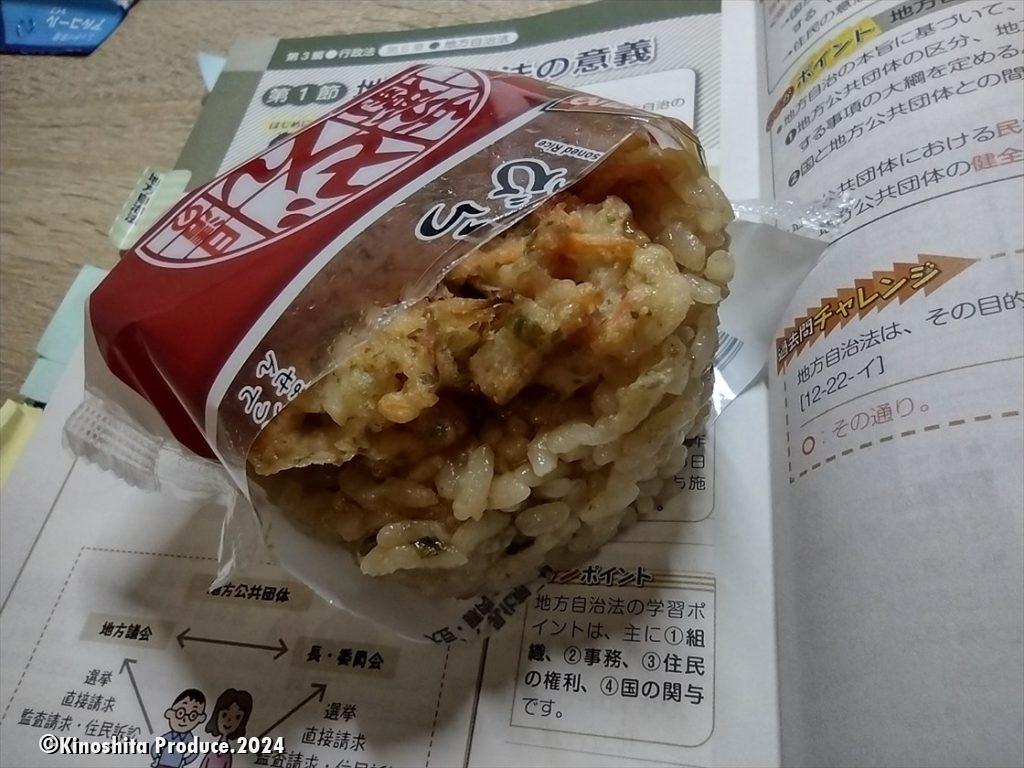 かき揚げ天丼おにぎりみたいな感じで結構美味しい。温めるといいかも。