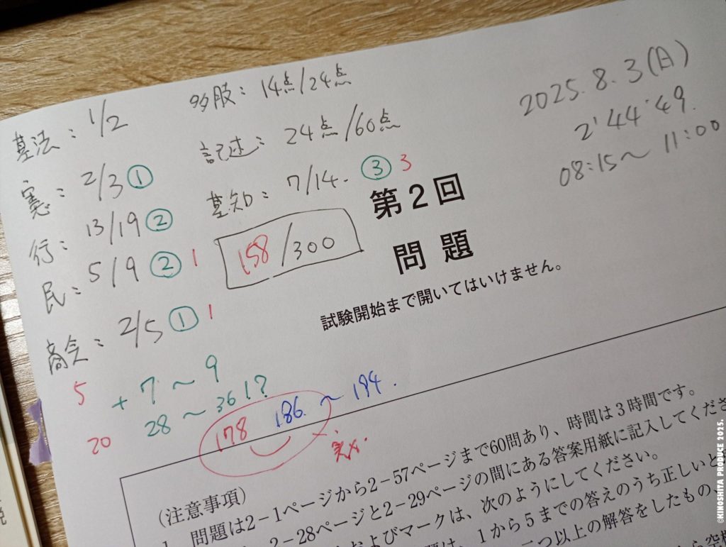 2時間45分。まあまあ。文章理解→基礎知識の順で解いていたけど、最近は基礎知識→文章理解→基礎法学という順にした。基礎知識の11問解いて頭を慣らしてから文章理解3問のほうが良いみたい。いきなり文章理解だと頭が硬い感じかな!?