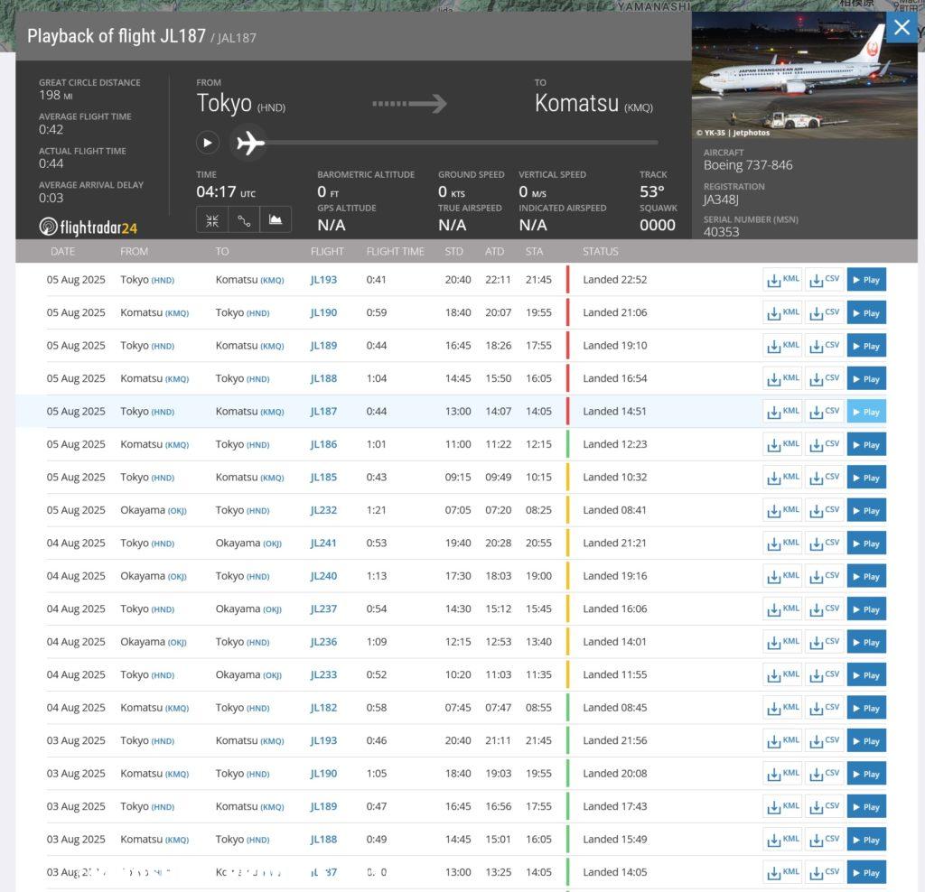 ちなみにその後の航跡を調べてみたら、岡山東京小松を行ったり来たりで、今日(8月10日)JTAらしく沖縄・石垣と飛んでいるみたい。