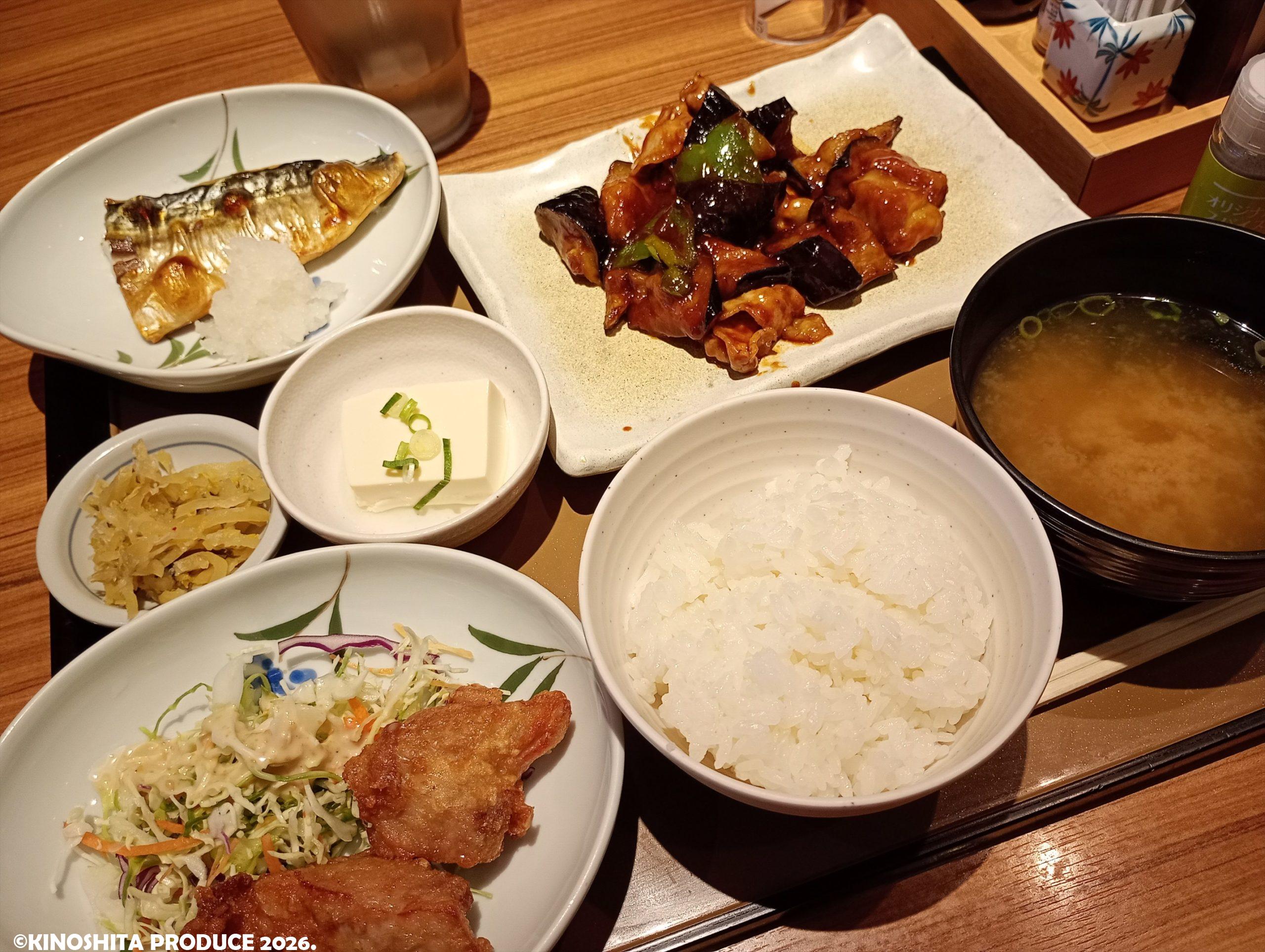 やよい軒では一番おすすめの豚ナス味噌炒めと焼き魚(さば)セット。+唐揚げが割引だったので追加してみた。豪勢だわ。こっちは大勢でほぼ満員御礼。待ちもいる感じ。