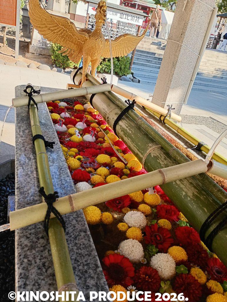 歯科の帰り。門前仲町の富岡八幡宮にて初詣。このくらいの時期だと混雑もせずよい。毎年こんな感じ。手水舎が花いっぱいでキレイ。