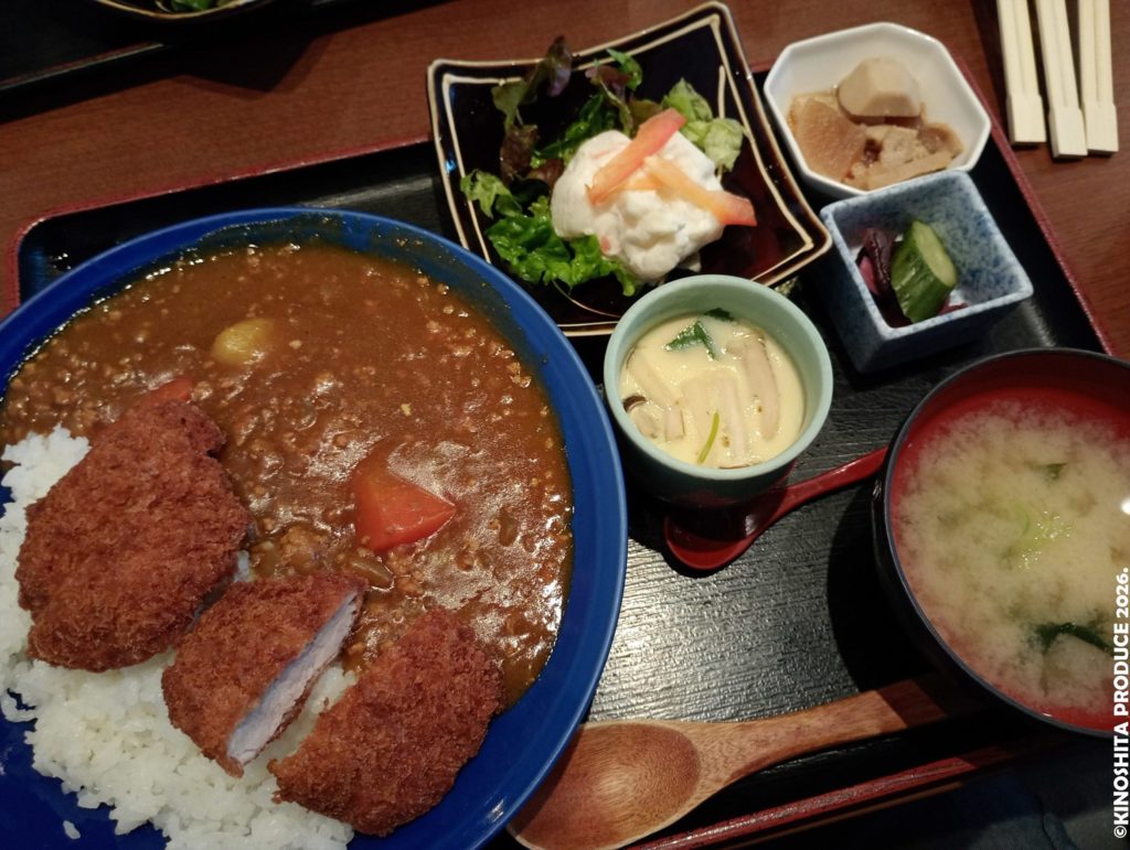 カツカレーにサラダに小鉢に茶碗蒸しに味噌汁。980円だったかな。